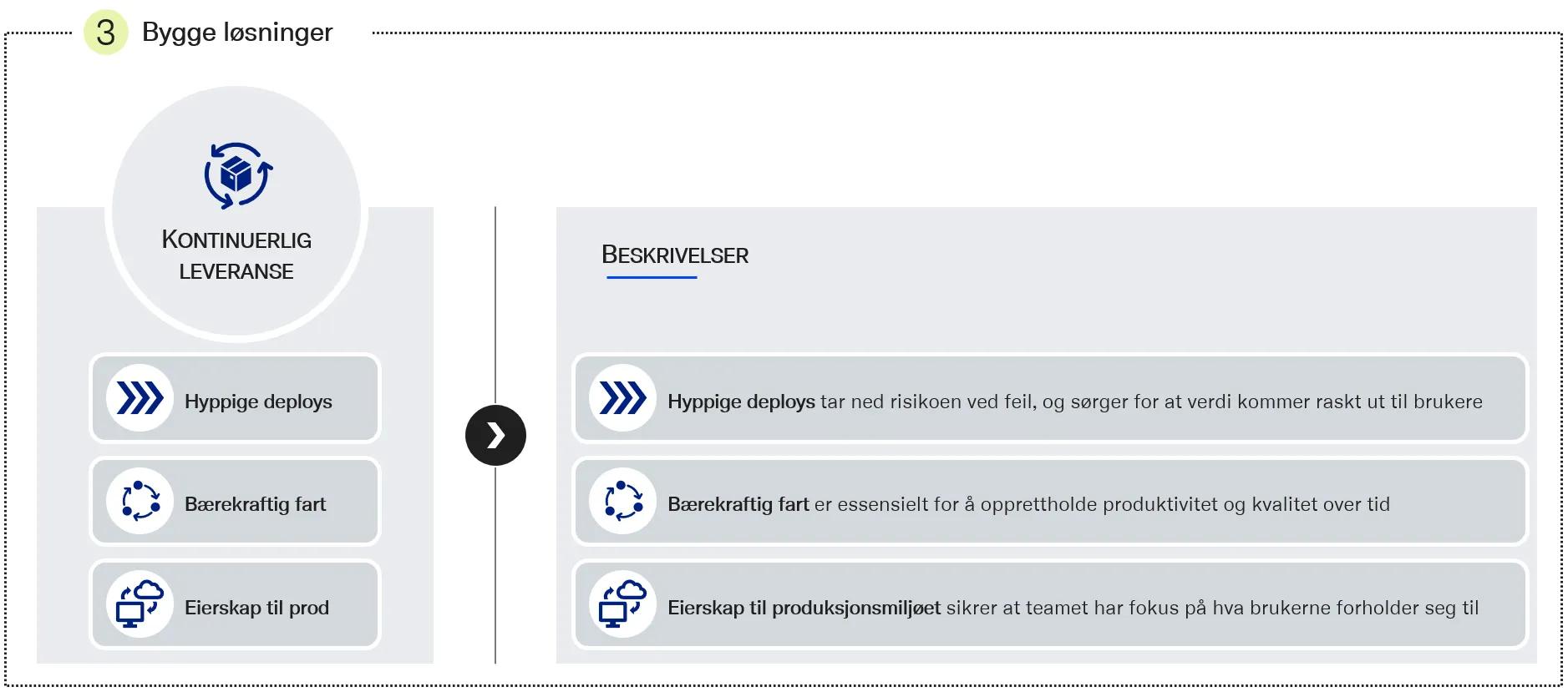 Kontinuerlig leveranse handler om å få ut endringer av alle typer til brukerne på en enklest, raskest og tryggest mulig måte. Ved å gjøre dette kontinuerlig og automatisere så mye som mulig, innarbeider vi rutiner som tar ned risikoen. Så fort vi har verdi klar, går den ut til brukerne. Det er skrevet veldig mye bra om dette tidligere, så jeg skal holde denne delen kort og fokusere på hovedpoengene.