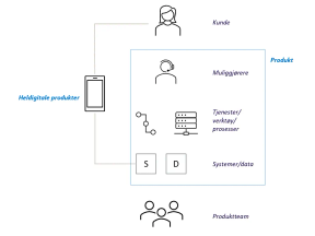 Det sentrale i en produktorientert tilnærming er erkjennelsen av at et produkt er helheten av det som skaper verdi for kunden. Dette betyr at et produkt ikke bare er en digital tjeneste som presenterer informasjon og funksjonalitet på en brukervennlig måte, men også prosessene det understøtter og kundeopplevelsen som omgir det. Dette er spesielt viktig å huske på når vi utvikler systemer, tjenester eller digitale verktøy som benyttes av muliggjørere som saksbehandlere, selgere, eller andre ressurser i verdikjeden.