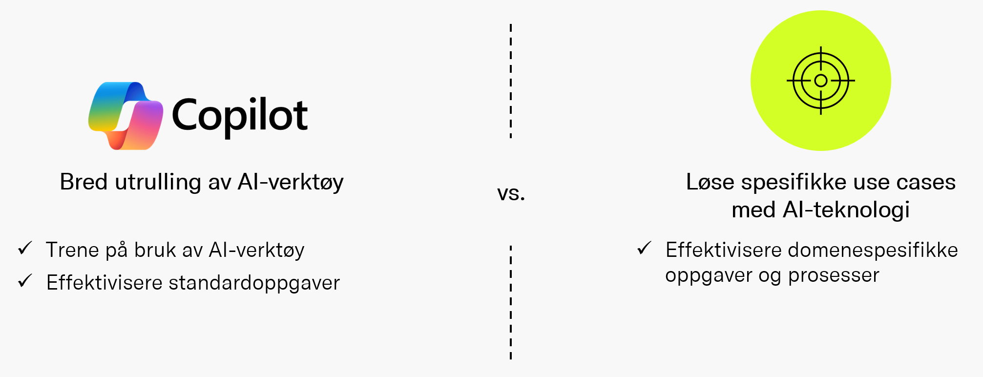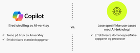 Når vi jobber med virksomheter som lykkes med AI, går den overordnede tilnæmringen igjen: de kombinerer bred utrulling av AI-verktøy med målrettede initiativer for å effektivisere konkrete oppgaver og prosesser. Det første handler om å gi ansatte bedre verktøy i hverdagen - eksempelvis Copilot integrert i arbeidsflyten. Dette gir raske, synlige gevinster og modne brukere. Det andre handler om å ta ut verdi på tvers av forretningsområder ved å løse spesifikke problemer: automatisere en tidkrevende rapportprosess, redusere feil i prognoser eller gjøre kunnskap mer tilgjengelig. Verdien ligger i kombinasjonen.